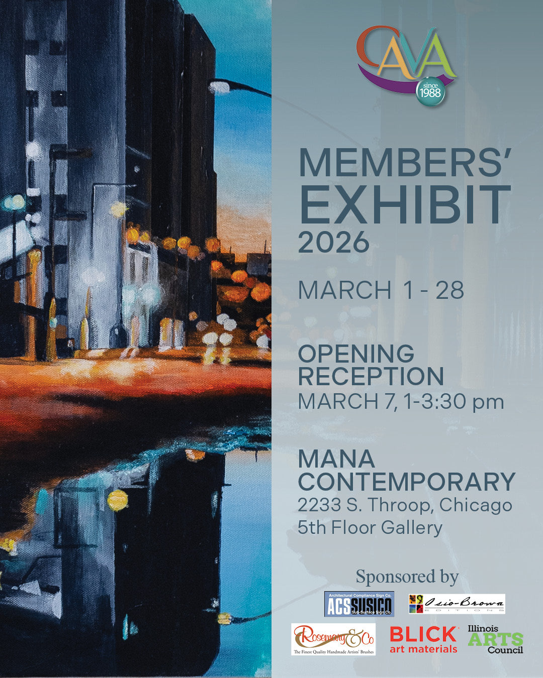The Chicago Alliance of Visual Artists presents its 2026 Members' Show. This juried show features local artists showing their work. Meet the artists and stay for the Best in Show announcement at 2pm.