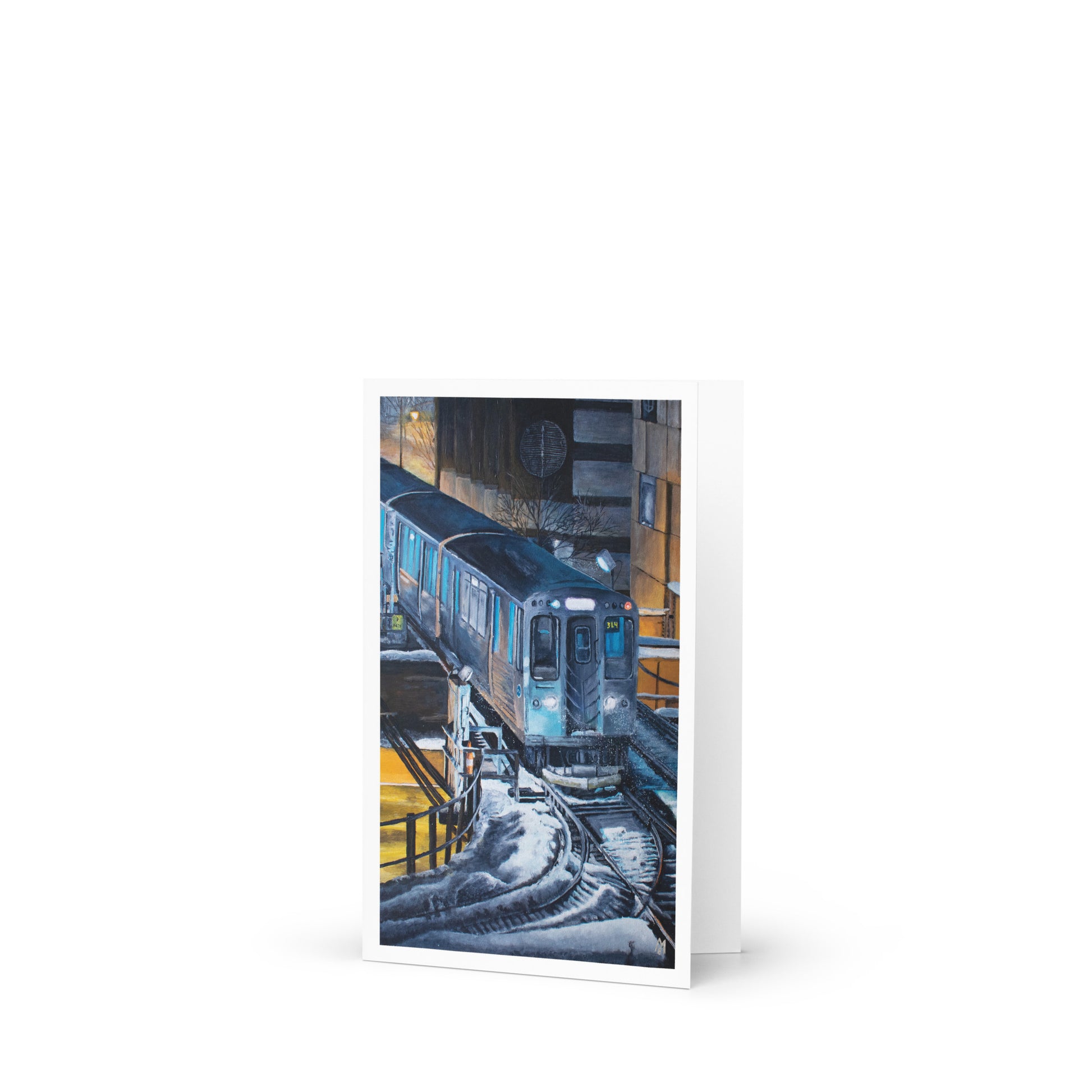 Winter flurries transform the downtown Loop as the El navigates snowy tracks, with warm station lights creating dramatic contrast against the swirling snow.