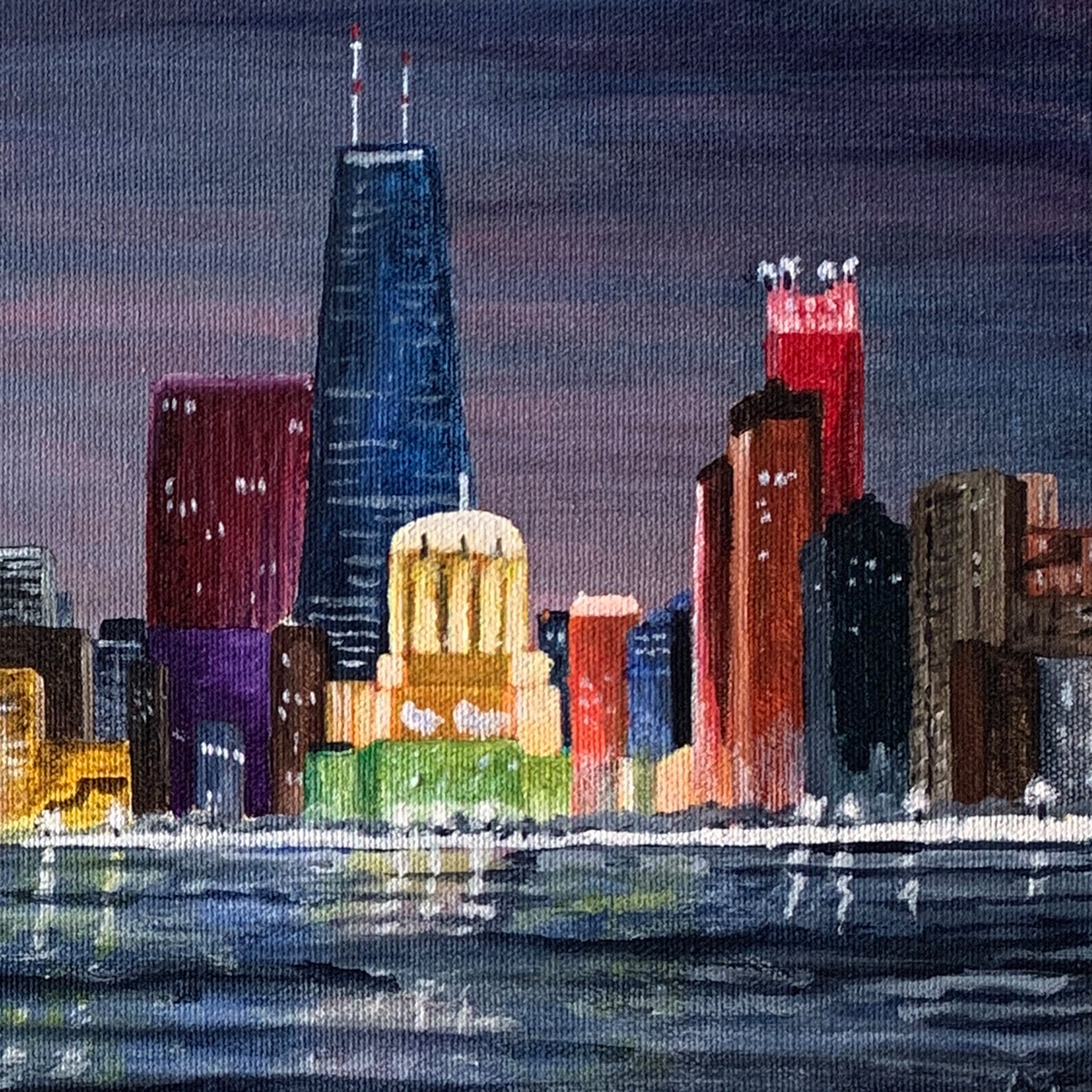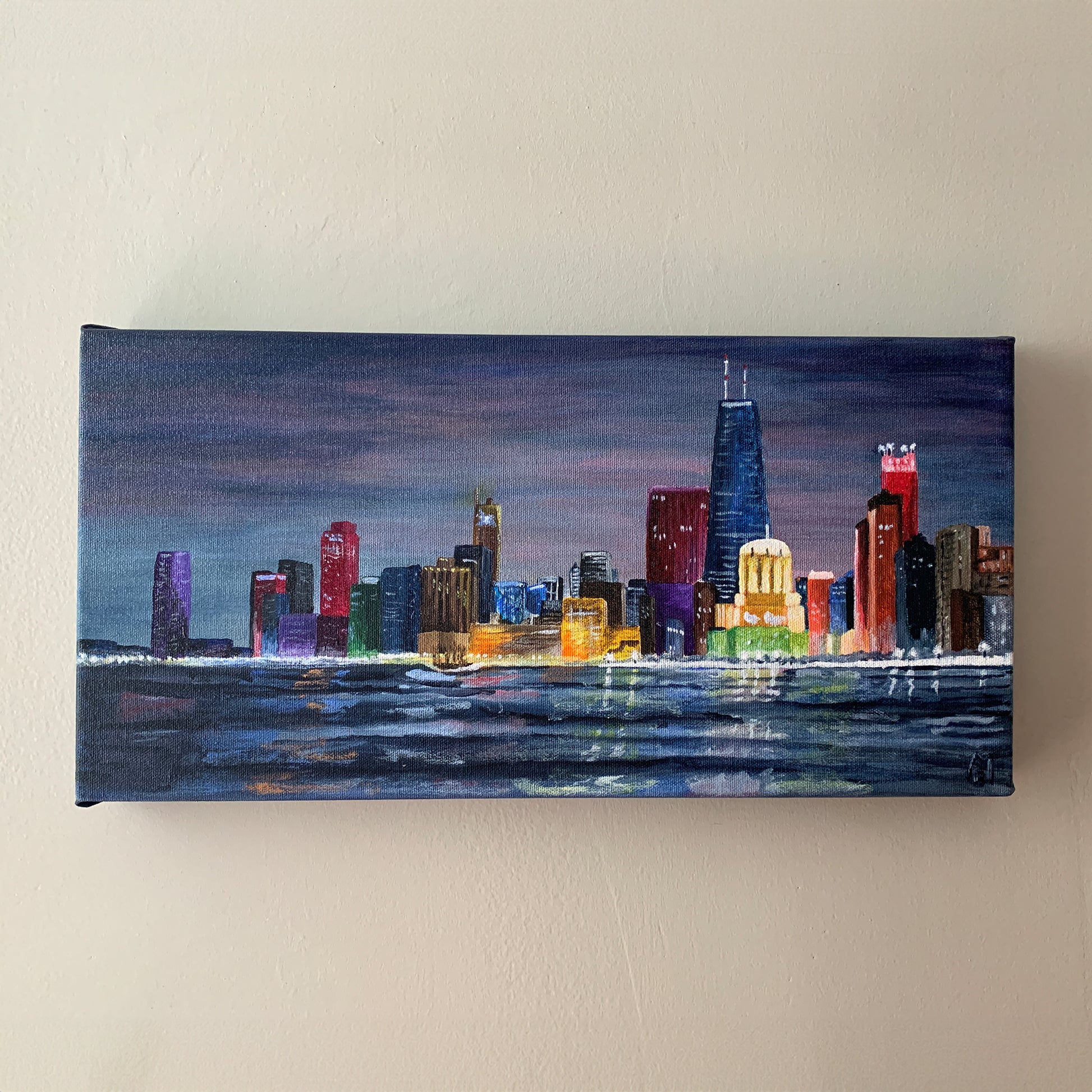 A painting of a photograph of the iconic Chicago skyline accented with bold colors mimicking the city’s vibrant energy.