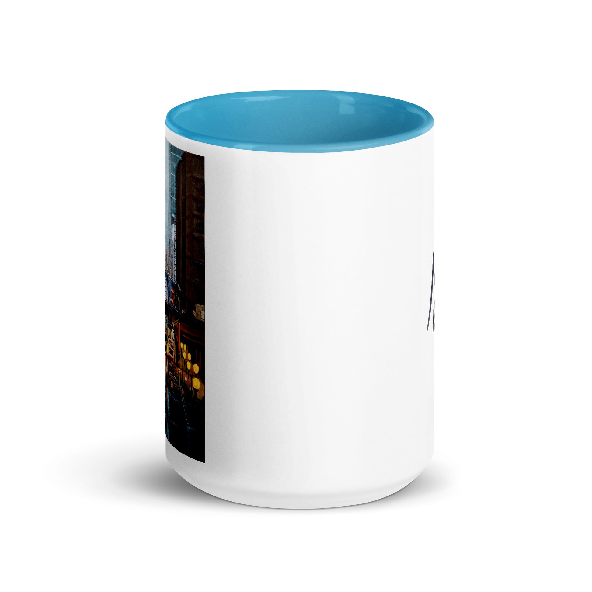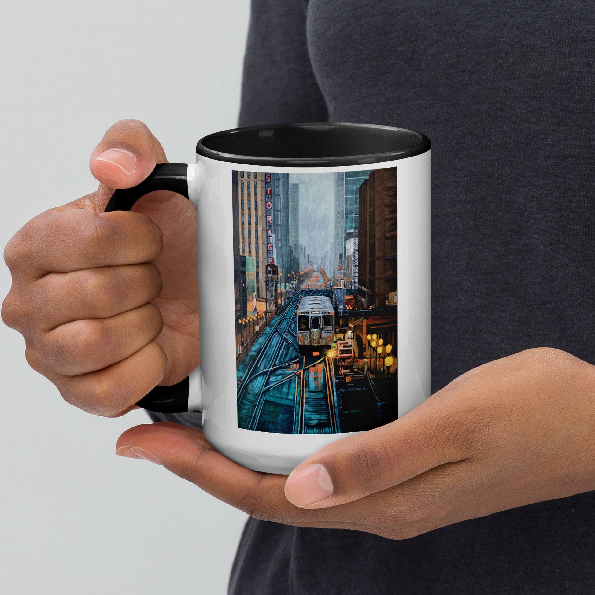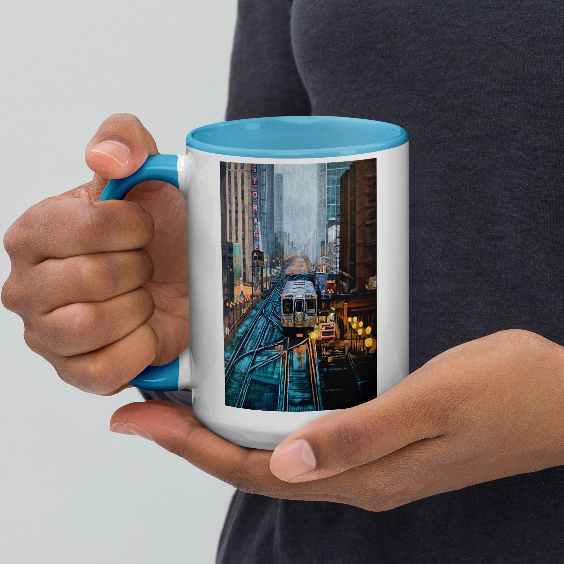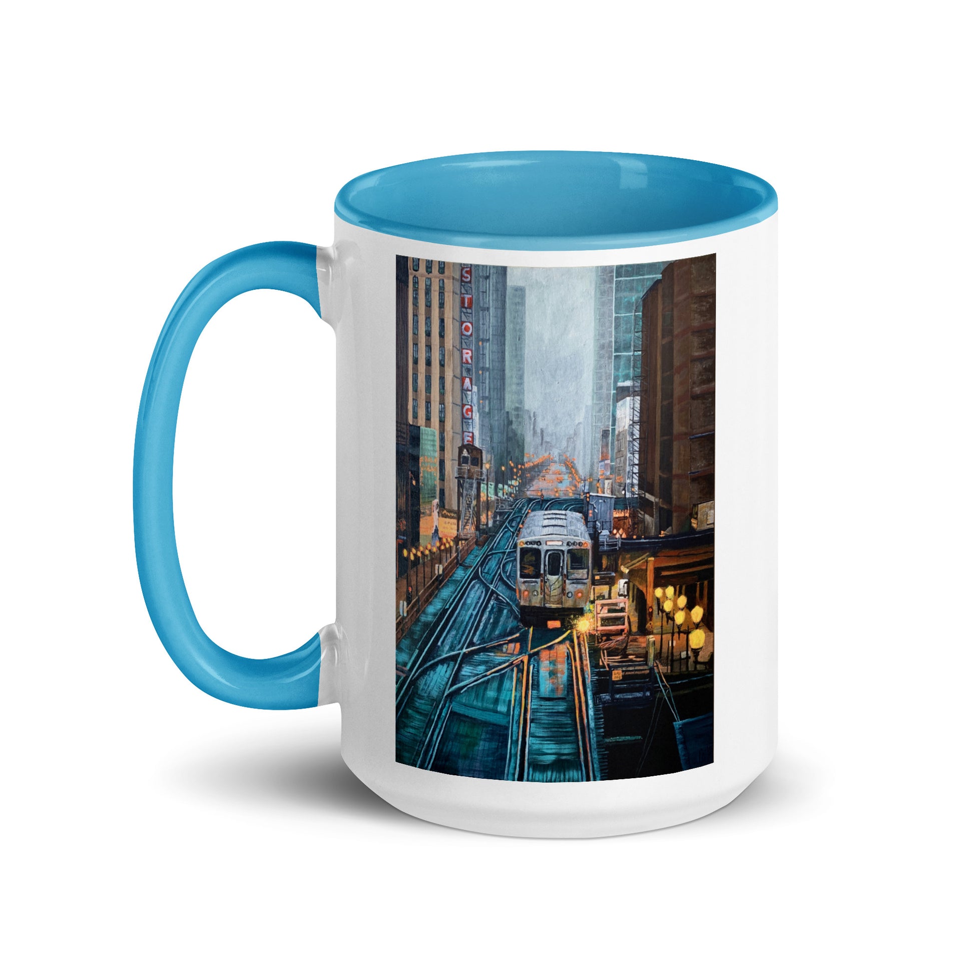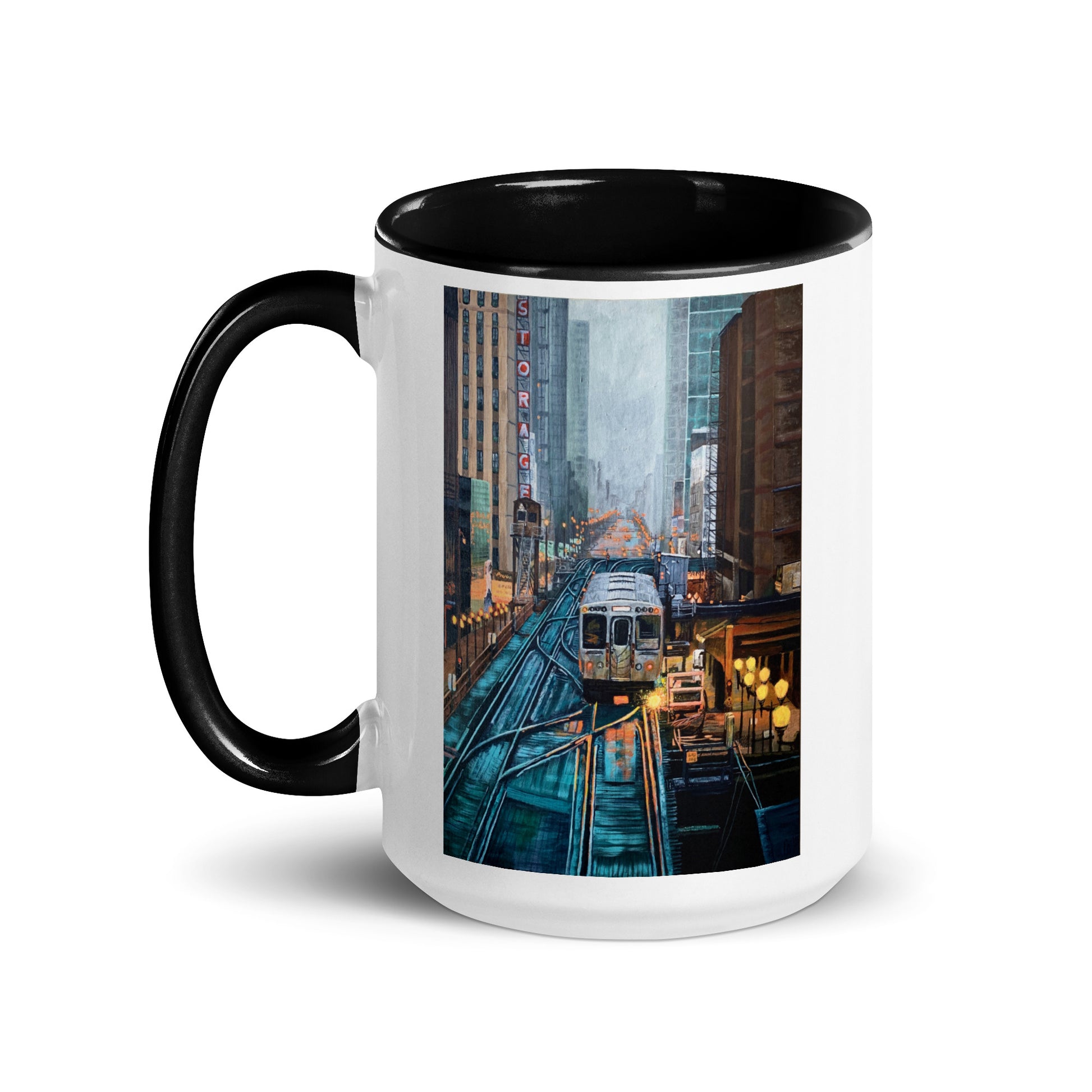 These ceramic mugs are adorned with an image of the original painting by artist Michael Bever titled "Foggy Downtown Train" and are accented with a colorful rim, handle, and inside, so the mug is bound to spice up your mug rack.