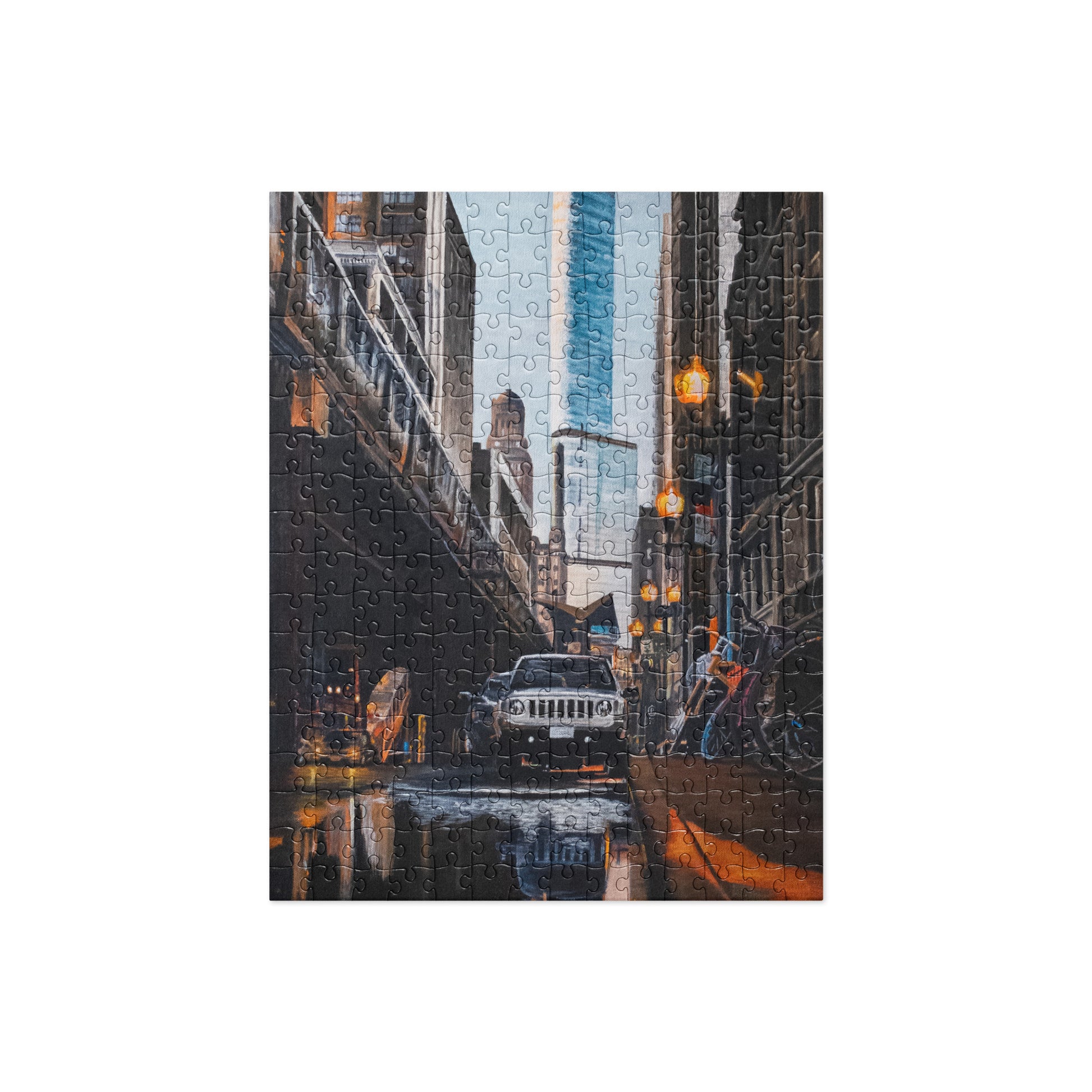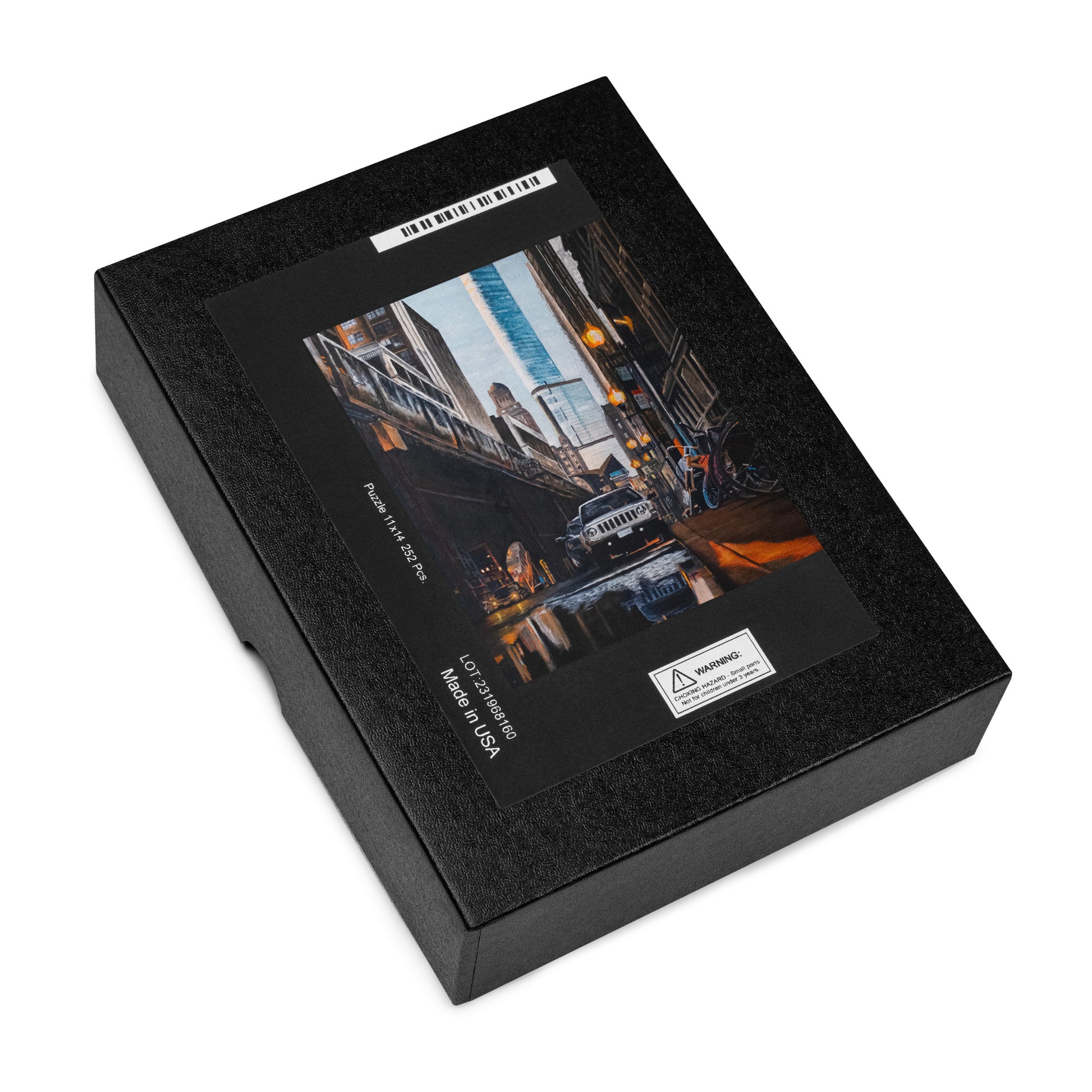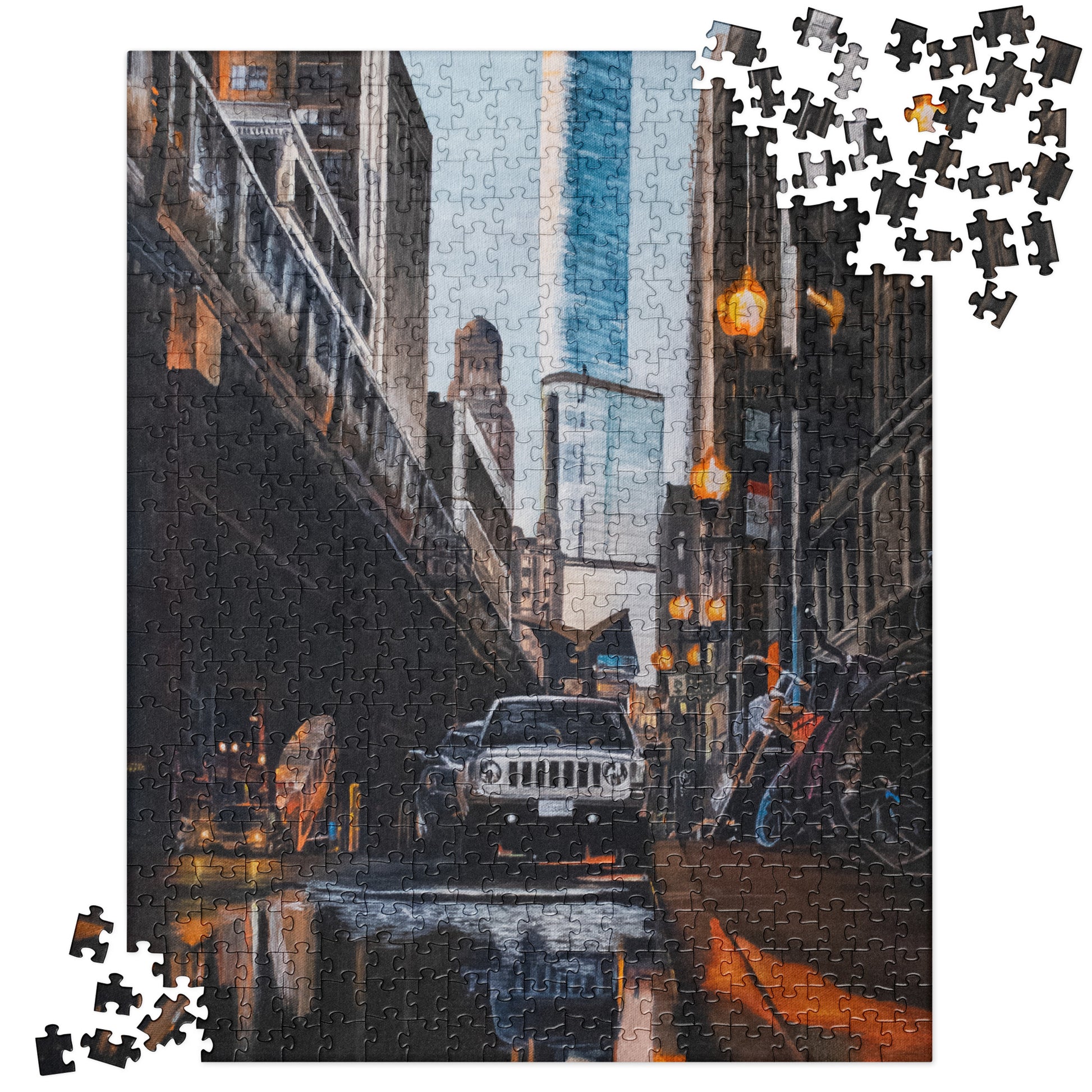 Assembling puzzles is the perfect family bonding activity. Treat yourself to a unique puzzle of an original painting by artist Michael Bever of the streets of downtown Chicago after a heavy rain. Reflections of cars, buildings and the El can be seen in this urban landscape. and gather your loved ones for an evening filled with joy and teamwork.