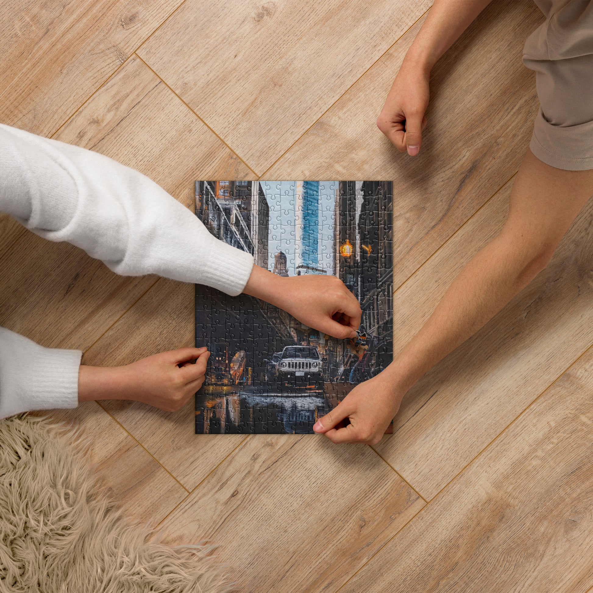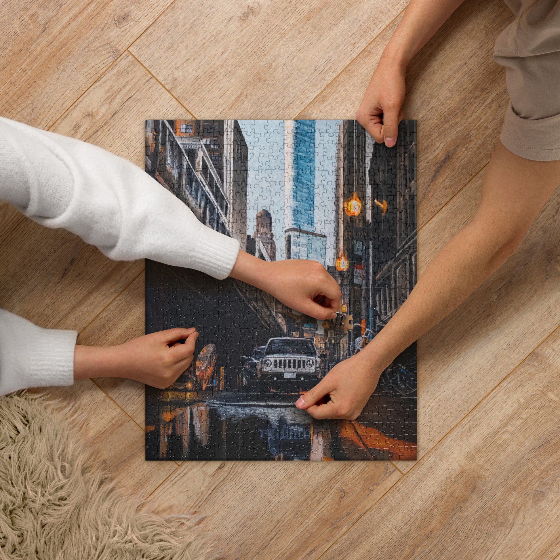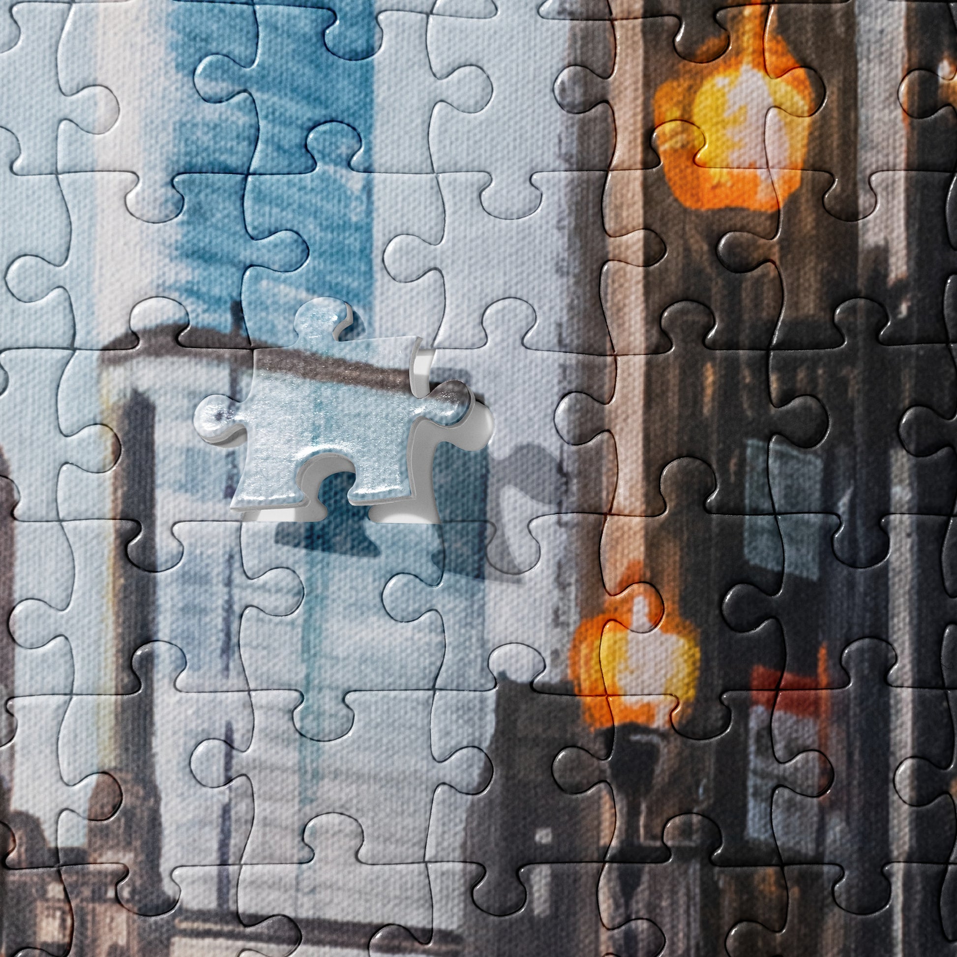 Assembling puzzles is the perfect family bonding activity. Treat yourself to a unique puzzle of an original painting by artist Michael Bever of the streets of downtown Chicago after a heavy rain. Reflections of cars, buildings and the El can be seen in this urban landscape. and gather your loved ones for an evening filled with joy and teamwork.
