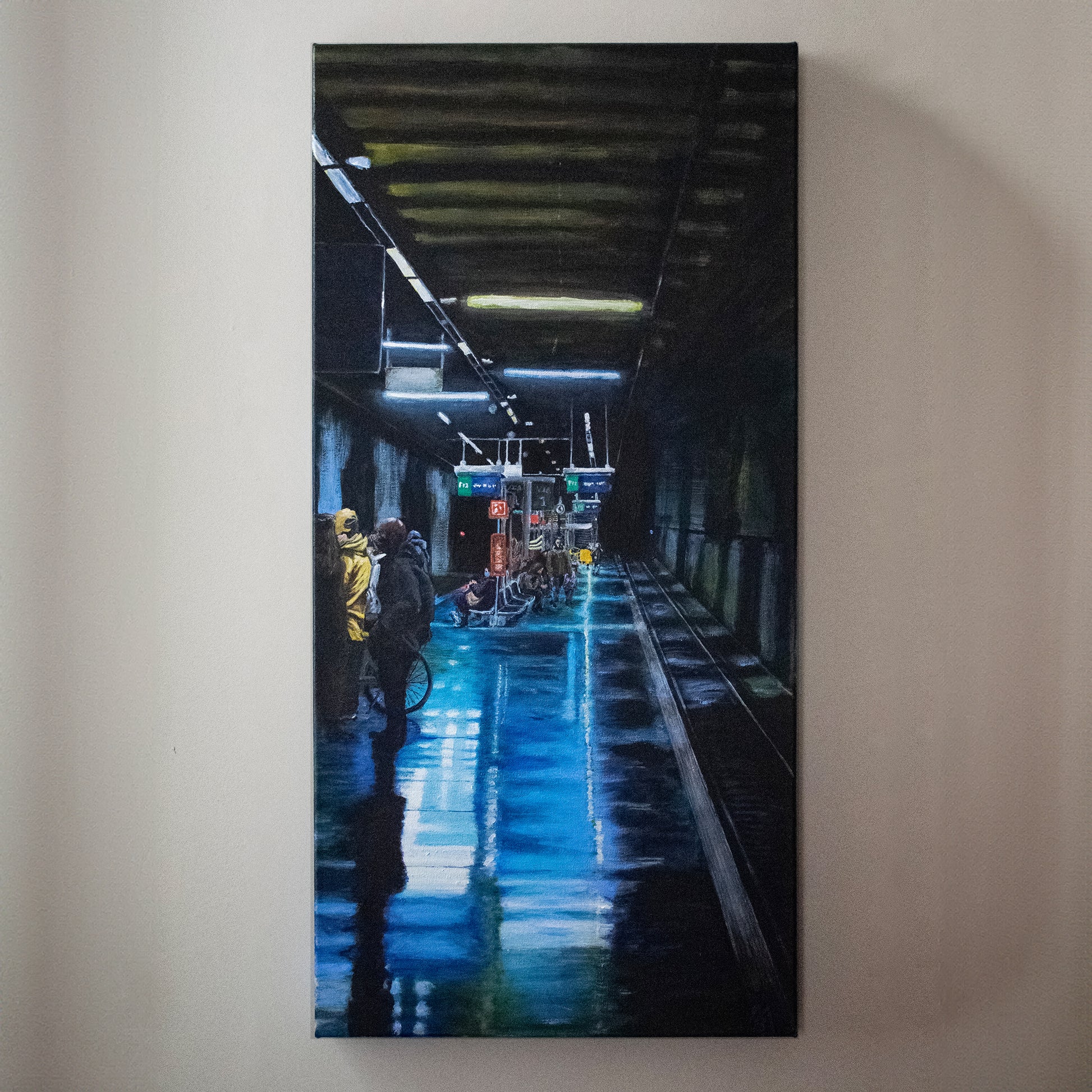 Deep beneath the city streets, the subway platform becomes a study in urban solitude and electric blue reflections. Michael captures that uniquely subterranean atmosphere where fluorescent lights create an otherworldly glow on wet platforms, and waiting passengers become silhouettes in the city's hidden arteries. It's the underground world most commuters experience but rarely pause to really see.