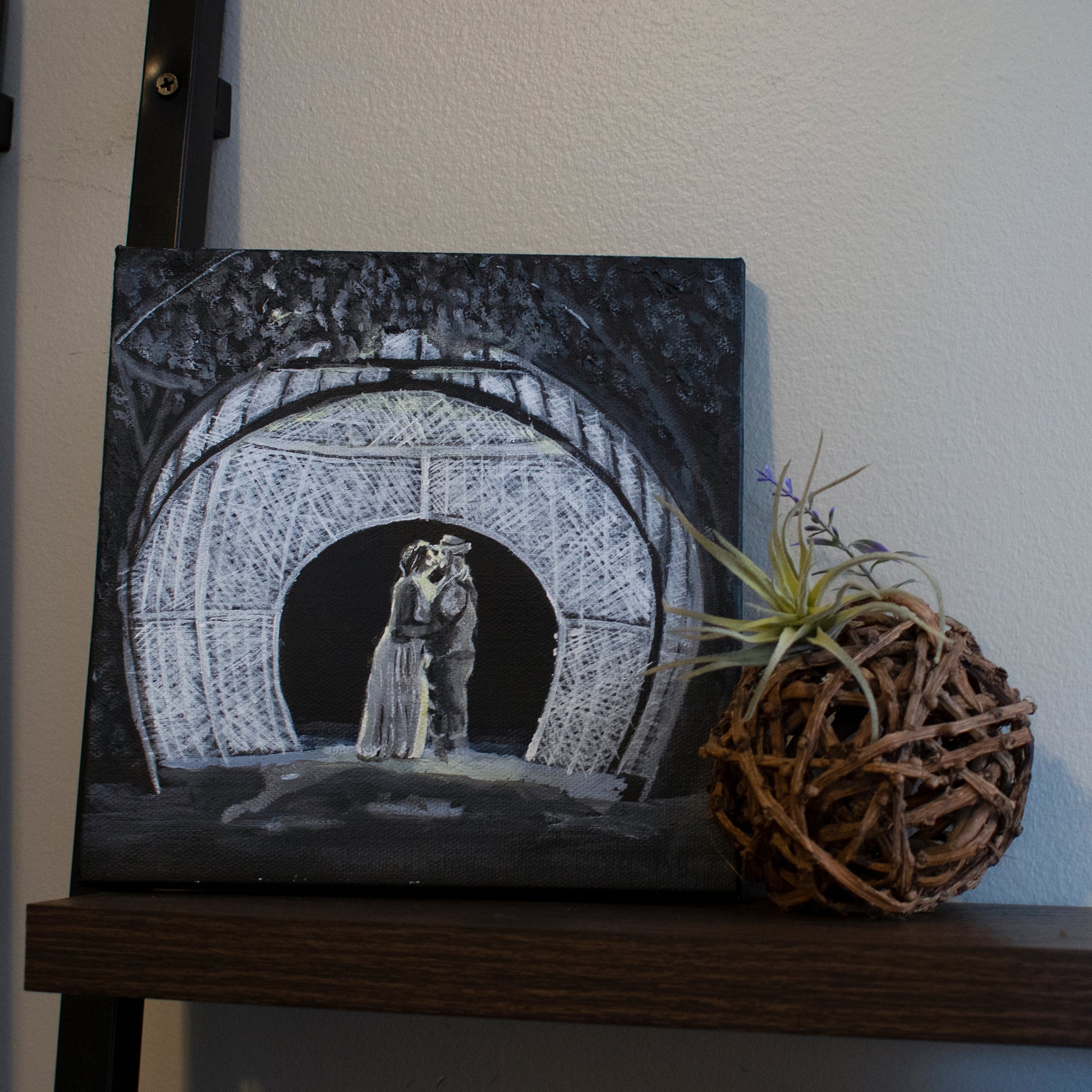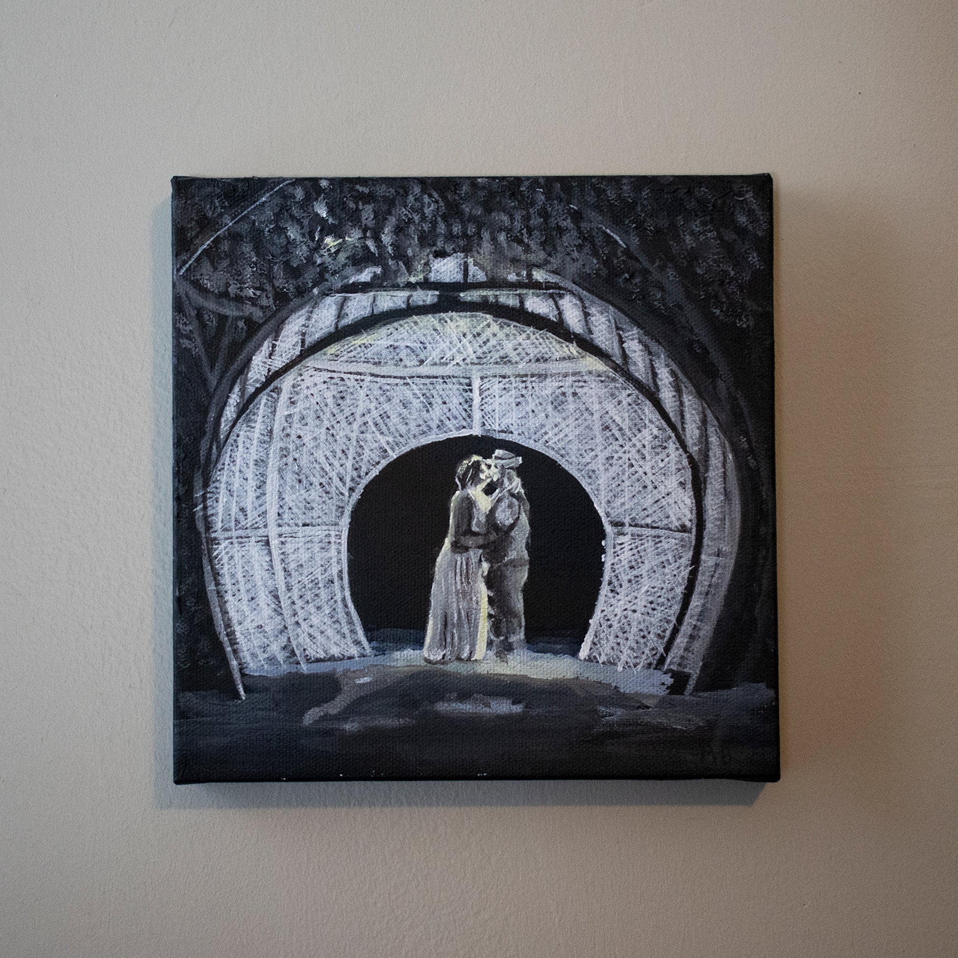 A black and white painting created from a photo of the client’s wedding for an anniversary gift.